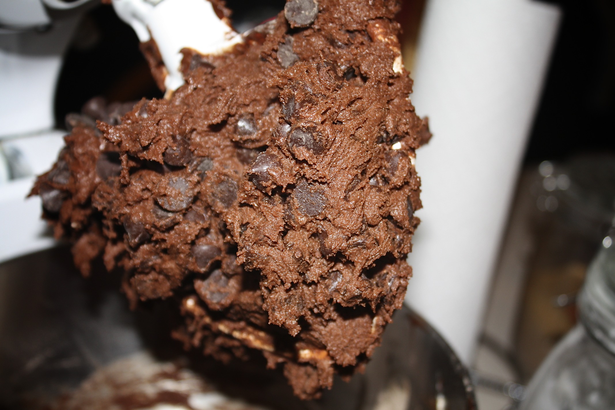 Continue mixing on low speed and add the egg and vanilla until incorporated. Then add your chocolate chips.
