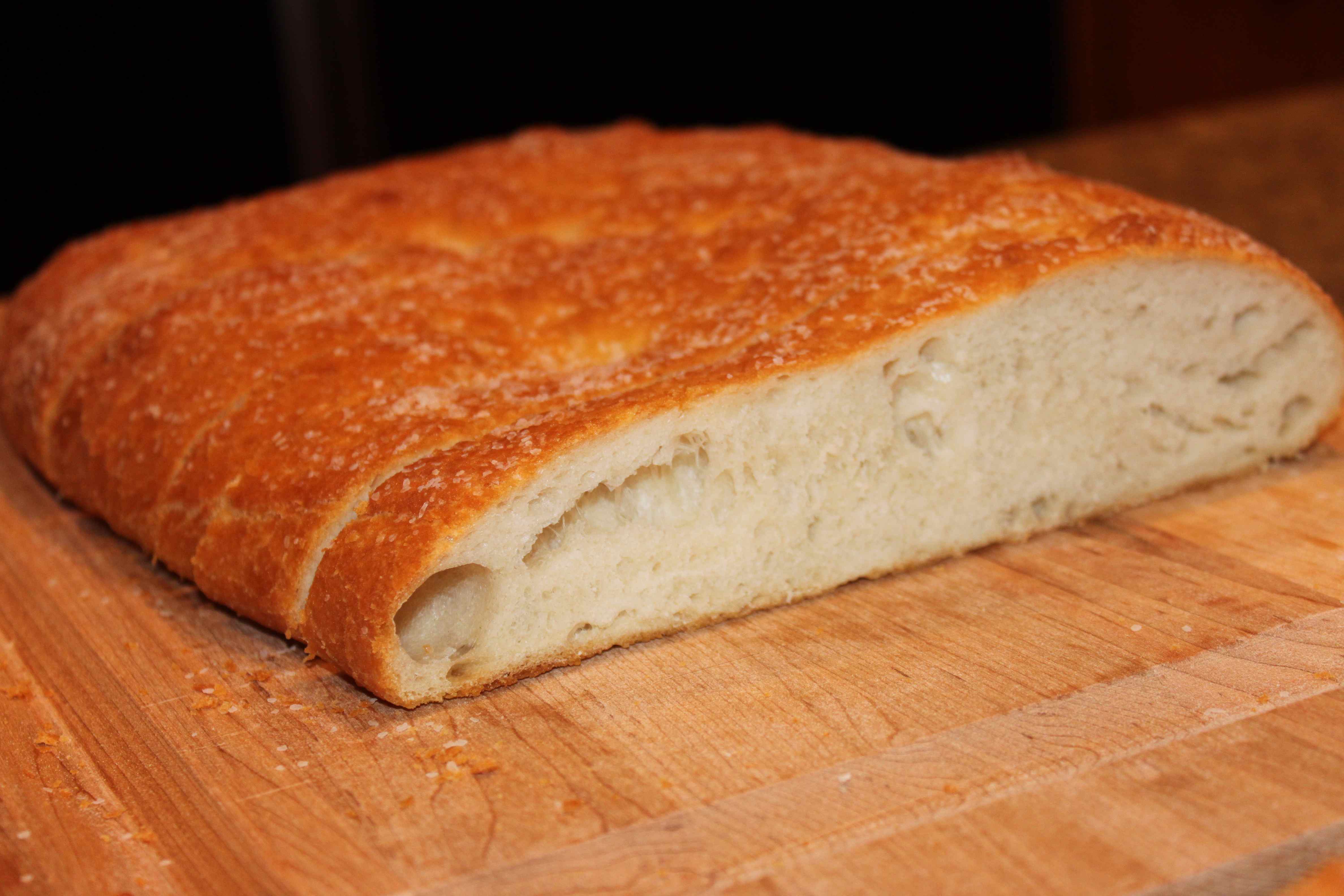 So many different shapes and sizes of bread. Decisions… Decisions. I have tried two different shapes. The traditional loaf and the ciabatta. Each is very different. I like to top either of these with a high quality garlic infused olive oil and some sea salt. Before placing the dough in the oven to cook I rub the olive oil all over the top of the bread and then sprinkle evenly with sea salt.