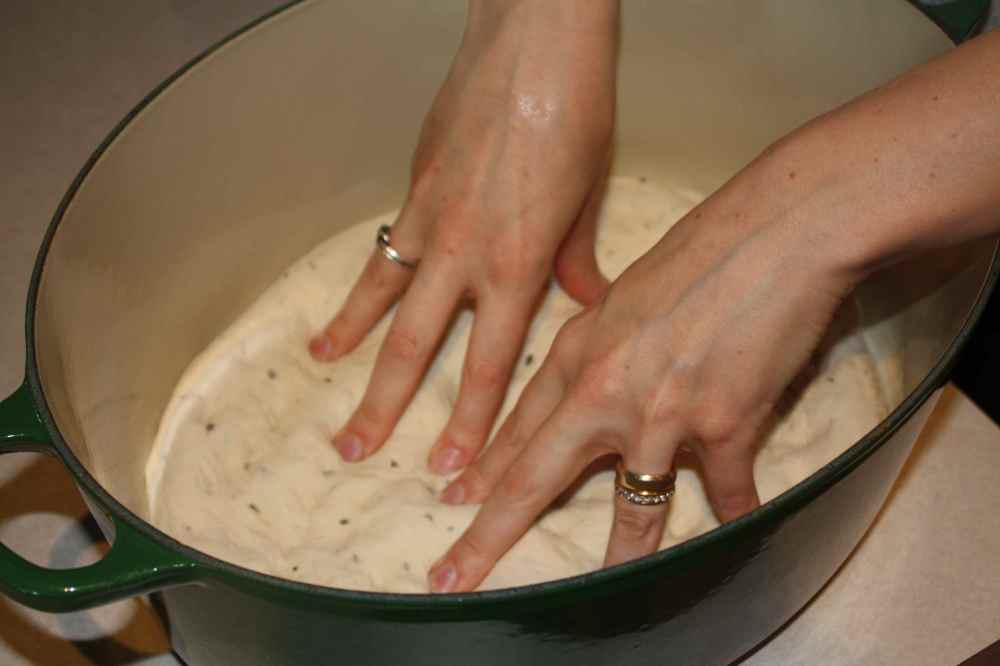 For the ciabatta loaf – (Ciabatta means slipper in Italian) you are going to carefully stretch the dough ball into a long oval shape… similar to a slipper. I start by holing one end of the dough ball with two hands and letting gravity pull the dough slowly towards the ground. I will then grab the opposite end of the dough with both hands and again let the dough stretch towards the ground. Once the dough has stretched as far as it will with gravity place the dough back on the countertop and pull it gently apart with you hands to finish stretching it out. You want the dough to be about 1 foot long and about an inch thick. Lightly coat an insulated cookie sheet with olive oil. Place the dough onto cookie sheet. (I’ve tried the ciabatta in a large dutch oven, but I think it comes out better on the cookie sheet).