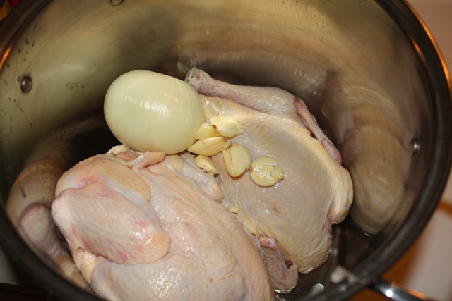 Unwrap and rinse the chickens. Make sure to take out any of the innards from the chickens. Most come with neck and livers inside, discard them. In a very large stock pot, (12 plus quarts) add the chickens, crushed garlic and the peeled yellow onion. Bring to a boil. Once it reaches a boil, simmer for 1 1/2 to 2 hours.