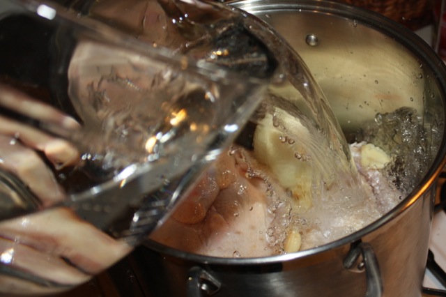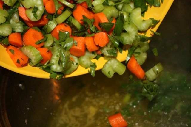 After simmering for an 1 1/2 to 2 hours, remove and discard the onion. Remove the chickens and set aside to cool. Add your bowl of chopped veg and bring the stock back to a boil. Lower the heat and simmer the veggies and stock for about 30 minutes until the veggies are soft.