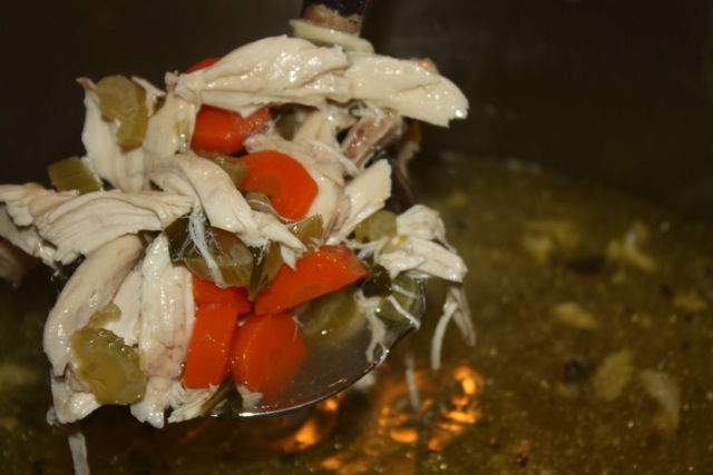 Once the chickens have cooled, carefully separate the chicken from the bones making sure to discard any funky pieces. Tear apart the chicken into small pieces with your hands. This will ensure that you have removed all of the bones and inedible pieces of chicken. Add the chicken back into the soup with the vegetables. Now for the noodles.