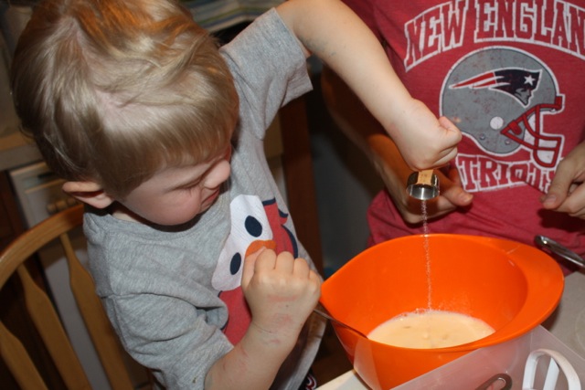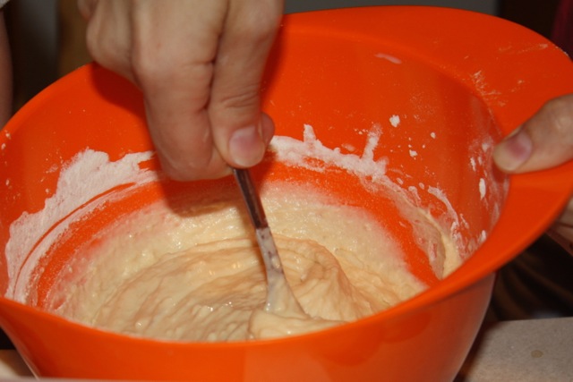 Making the noodles (Country Noodles also sometimes called Spaetzle) from scratch is the most time consuming piece of the recipe. Up until this point we’ve chopped a few veggies and waited for time to pass. In a separate pot bring 4 quarts of water to a boil, salt the water with about 1 Tbsp kosher salt. In a bowl, combine the eggs, milk, salt and flour. Mix until smooth.