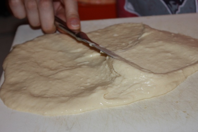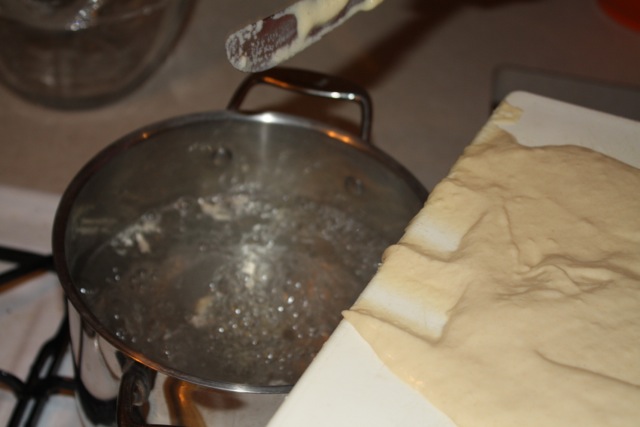 On a clean flat cutting board pour 1/3 of the noodle batter onto the cutting board. Use a butter knife to evenly spread the batter across half of the cutting board up to one edge. While holding the cutting board over the pot of boiling water, use the butter knife to shuck (or scrape) small, even amounts of the batter into the water. Have fun with the size of your noodles, tailoring them to the size you like. Cook the noodles in batches, making sure the water continues to boil.