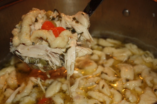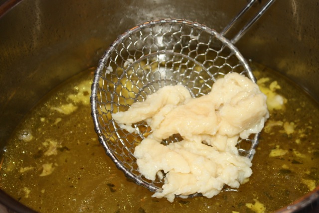 As the noodles rise to the top they are done cooking and can be transferred to the chicken soup with a slotted spoon or a spider. The noodles cook fast, in about 30 to 60 seconds depending on how large they are. Repeat and continue this process until no batter remains and all of the noodles have made their way into the stock pot full of soup.
